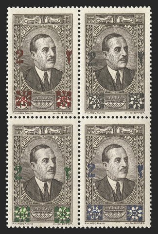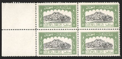 690 nhbl   Image1925 Undenominated Djebel-Druze commemoratives cplt. set of three in blocks of four (two are margin blocks), bright and fresh, o.g., n.h., very fine. (Image) Est. $300-400