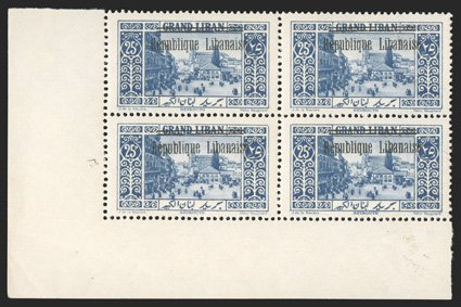 691 nhbl Yvert #85/97 var. ImageYvert #85-87 var., 97 var., 1927 50c, 1pi, 1.50pi and 25pi "Republique Libanaise" overprints, with thin bars at top, each in a corner sheet-margin block of four except 50c is a left margin block, o.g., n.h., very fine. (Image) Est. $400-500