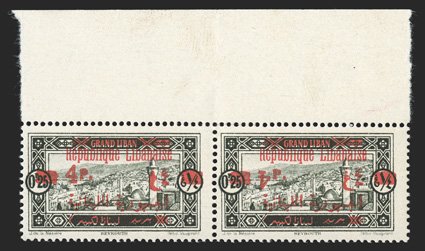 692 nh Yvert #119b ImageYvert #119b, 1928 4pi on 25c Olive black, inverted "4p.", top margin horizontal pair, the right stamp being the error, while the left stamp is normal, strong color, o.g., n.h., very fine and quite scarce (Scott #104 var.). (Image) for hinged €460