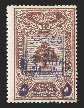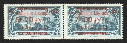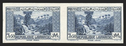 695 og Yvert #156A ImageYvert #156A, 1937 7.50pi Blue, Unissued value, imperforate, horizontal pair with large margins all around, strong color on fresh paper, o.g., lightly hinged, very fine; a handsome pair of one of the key rarities of Lebanon; signed Calves. (Image) €3,200+