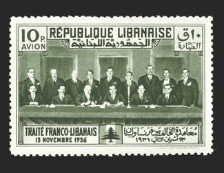 694 og Maury #149A-D, PA56A ImageMaury #149A-D, PA56A, 1936 50c-10pi Franco-Lebanon Treaty, unissued set cplt. including the 10pi Air post, brilliant colors, o.g., lightly hinged, very fine. (Image) €1,250