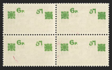 698 nhbl Yvert #183a, b ImageYvert #183a, 183b, 183 var., 1943 6pi on 7.50pi Carmine, group of error blocks, five items, including the two listed errors of inverted surcharge and black surcharge, plus double surcharge, double surcharge one inverted, and surcharge printed on front and back, all are in fresh mint blocks of four, o.g., n.h., very fine (Scott #161 var.). (imagea) (Image) Est. $500-750