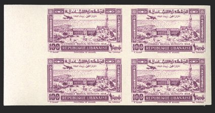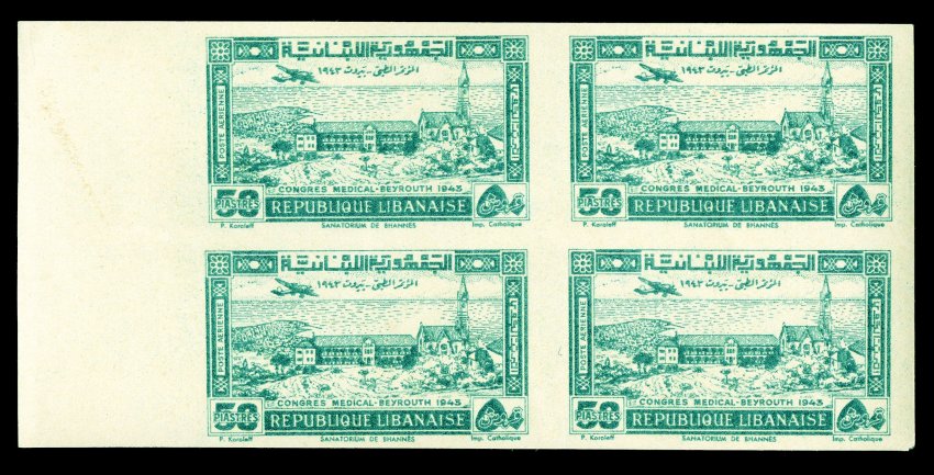 699 nhbl Yvert #187-88 var. ImageYvert #187-88 var., PA82-84 var. 1944 10pi-100pi Arab Medical Conference, imperforate and without surcharge cplt., each in a left sheet-margin block of four, large margins, bright colors, o.g., n.h., extremely fine; each signed Calves (Scott #167-68 var., C88-90 var.). (imagea) (Image) for hinged €10,000+