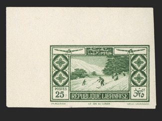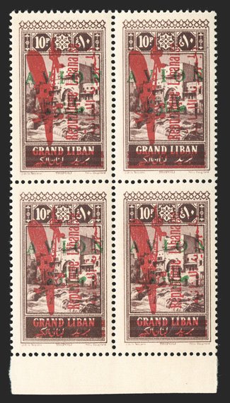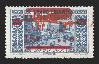 702 nh Yvert #PA36 var. ImageYvert #PA36 var., 1928 15pi on 25pi Dark blue, surcharged on Yvert #97 in error, surcharged on the stamp with black "Republique Libanaise" (Sanabria #52), excellent centering, o.g., n.h., very fine; signed J-F Brun (Scott #C36 var.). (Image) Est. $300-400