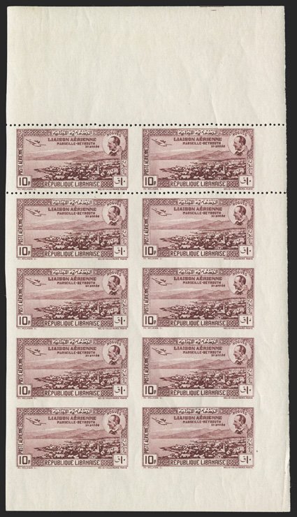 706 nhbl Yvert #PA79b ImageYvert #PA79b, 1938 10pi Brown lilac, imperforate, block of ten with full selvage on three sides, the top stamps are perforate, while the bottom eight stamps are imperforate, fresh color, o.g., n.h., extremely fine; a handsome showpiece; cataloged as eight imperforate hinged singles (Scott #C79 var; $2,000.00+). (Image) €2,240+