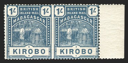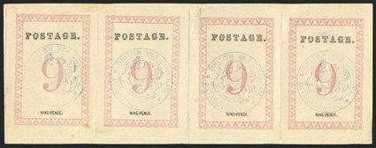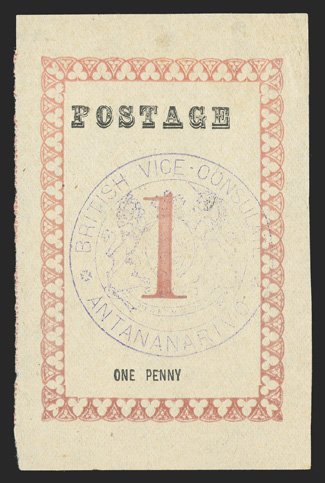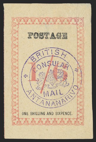 711 og S.G. #20a ImageS.G. #20a, 1886 9p Rose, Ty. I, "British Vice-Consulate" handstamp in violet, a very rare strip of four, which represents the complete sheet, completely intact, each stamp with o.g. in two corners, right stamp with a thin, a couple other tiny thin specks, small closed tear at top of third stamp, a few minor toned spots, overall of very fine appearance; any Madagascar Consular stamp in an intact strip of four is difficult to find, but to encounter one of the scarcer stamps such as this is nearly impossible, this particular sheet is believed to be unique (Scott #24; $4,000.00+). (Image) £4,800+