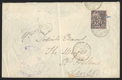 716 c   Image"BRITISH CONSULAR MAIL ANTANANARIVO" circular handstamp in violet, on 1887 cover from Madagascar to St. Helens, England, France 25c Black on red tied by Tamatave 17 Oct. 87 c.d.s., Paris and Liverpool transit backstamps, St. Helens receiver of Nov. 14, cover with light vertical filed fold not affecting stamp or markings, stamp with trivial toned spot, fine. (Image) Est. $400-500