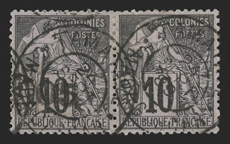719 O Maury #1d ImageMaury #1d, 1889 "05" Surcharge on 10c Black on lavender, one without surcharge, a very rare used horizontal pair, the right stamp the error, choice centering and very fresh, with strong and intact perforations, neat 24 September 1889 postmarks, extremely fine; very few such error pairs exist; signed Behr, A. Brun and Calves (Scott #1d; $2,000.00). (Image) €3,750