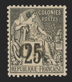 720 og Yvert #2 ImageYvert #2, 1889 "05" Surcharge on 25c Black on rose, fresh mint single, o.g., very fine; only 2,000 stamps were surcharged (Scott #2; $650.00). (Image) €1,000
