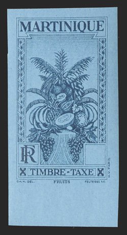 822 nh Yvert #TT12-22 var. ImageYvert #TT12-22, 1933 5c-3Fr. Postage dues, imperforate and without value, a rare complete set of all eleven values, each a top or mostly bottom sheet-margin singles with large margins on the other sides, o.g., n.h., extremely fine; only five values are listed in Yvert as such with a catalog value of €100 each, so we have cataloged them all the same (Scott #J26-36 var.). (Image) for hinged €1,100