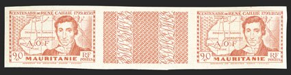 823 nh Yvert #95a var. ImageYvert #95a var., 1939 90c Caillie, large legend and imperforate, horizontal gutter pair, large margins, bright color, o.g., n.h., extremely fine; especially scarce and desirable as a gutter pair (Scott #109 var., Maury #99a var.). (Image) Maury €1,200+