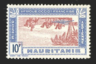 824 og Yvert #PA15a ImageYvert #PA15a, 1942 10Fr. Ultramarine and carmine air post, center inverted, handsome example of this rare error, bright colors, o.g., lightly hinged, very fine; only one sheet of 50 was printed; signed Champion (Scott #C11a; $750.00). (Image) €1,200