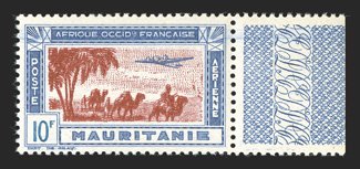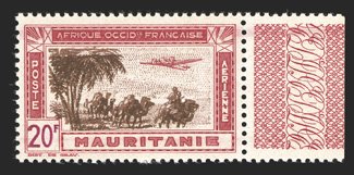 826 nh Yvert #PA16 var. ImageYvert #PA16 var., 1942 20Fr. Carmine and brown air post, double impression of center, right sheet-margin single, vibrant colors, o.g., n.h., very fine (Scott #C12 var.). (Image) Est. $300-400