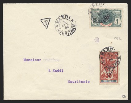 827 c Yvert #TT6 ImageYvert #TT6, 1906 30c Red and blue, with "T" in triangle, tied by "KAEDI MAURITANIE/9 OCT. 06" c.d.s., along with 1c Green and red (#1) on local cover, Kaedi backstamp of the same day, very fine; the 40c is the key value of the postage due series, and is especially difficult to find on cover; signed Roumet (Maury #TT9). (Image) Maury €1,900