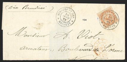 828 c Maury #(5) ImageMaury #(5), French Colonies 1859 40c Orange on yellowish, single with large to huge margins all around, tied by perfectly struck "Mayotte et Dep., Mayotte/10 Sept. 77" datestamp to folded cover to France, postmark repeated at left, "via Brindisi" directive and red transit postmark, cover with bottom portion of address panel missing, very fine and rare usage (Scott French Colonies #5). (Image) €4,250