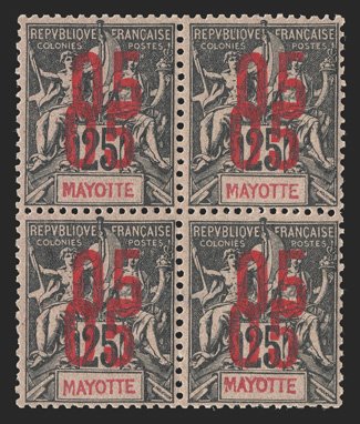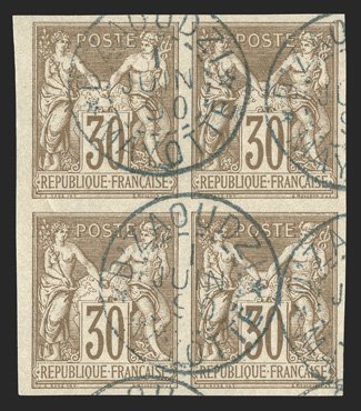 829 Obl Maury #(33) ImageMaury #(33), French Colonies 1878 30c Brown on yellowish, block of four cancelled by several strikes of "D'Zaoudzi, Mayotte/1 Juin 90" postmarks, large to huge margins all around, fresh and extremely fine (Scott French Colonies #26). (Image) for singles €1,800