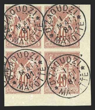 830 Obl Maury #(34) ImageMaury #(34), French Colonies 1877 40c Vermilion on straw, handsome bottom right corner margin block of four, beautifully cancelled by four strong strikes of "D'Zaoudzi, Mayotte/1 Mai, 81" datestamps, large margins, wonderfully fresh, extremely fine (Scott French Colonies #27). (Image) for singles €600