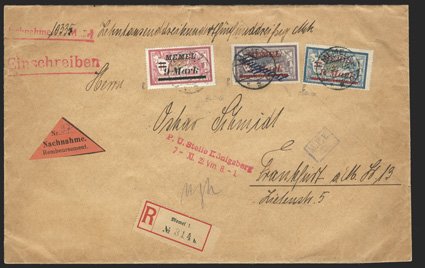 834 c Mi #79 ImageMichel #79, 1922 3M on 60c Dark gray violet, Plate III, tied to a large registered cover to Germany along with Michel #71 and 93 by Memel 8.11.22 c.d.s. postmarks, Military Postal Control handstmap, Frankfurt backstamp, stamps with fresh color, fine-very fine; a particularly rare stamp on cover; signed several times and accompanied by a 1997 Petersen certificate (Scott #C14 var.). (Image) €3,000