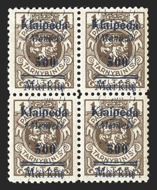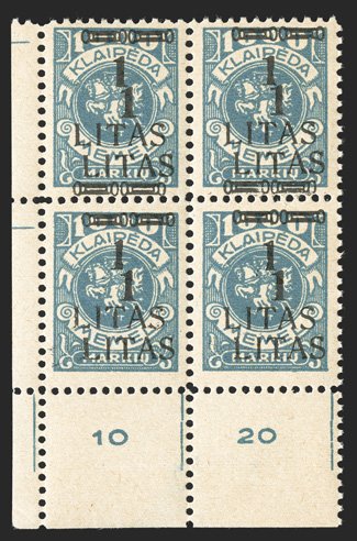 836 nhbl Mi #192DD ImageMichel #192DD, 1923 "1 LITAS" surcharge on 1,000M Green blue, double surcharge, bottom left corner margin block of four, each stamp with two strong and distinct surcharges, o.g., n.h., top stamps with minor black offset on gum, very fine (Scott #N69a; for singles $1,200.00). (Image) for singles €1,000