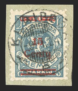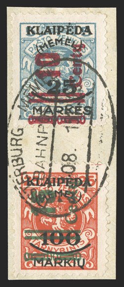 839 p Mi #230III, 231III ImageMichel #230III, 231III, 1923 10c on 25M on 5c and 15c on 100M on 25c Surcharges, Type III, tied to a single piece by an unusual oval "INSTERBURG-MEMEL BAHNPOST Z. 108 15.12.23" handstamp, bright fresh colors, very fine; 1977 Dr. Petersen certificate (Scott #N87, N88 vars.). (Image) €600