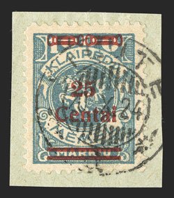 838 p Mi #221 ImageMichel #221, 1923 "25 Centai" on 1,000M Green blue, tied to piece by clear Silute 20.X.24 c.d.s., rich bright color, well centered, very fine; signed Dr. Petersen BPP (Scott #N111; $375.00). (Image) €440