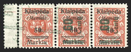 840 og/nh Mi. #233 var. ImageMichel #233 var., 1923 60c on 50M on 25c Dark cinnamon red, major printing variety of the 60c green surcharge, left margin horiz. strip of three, the right two stamps have a normal strong green surcharge, but the left stamp has no green surcharge from that press pass, producing the variety with and without surcharge, however there is a light second green surcharge misplaced and at an angle that is found in the left and center stamp with just traces of it in the right stamp, this produces the variety of double overprint on center stamp, o.g., hinged in the center stamp only, this variety was probably produced by a malfunction of the press as evidenced by a light printing crease in the left stamp and an extensive smudge of the green overprint ink on the gum side, a most interesting variety for the specialist with neither variety listed by Michel; 2000 Erdwien BPP certificate; ex-Lewis (Scott #N90 var.). (Image) Est. $400-500