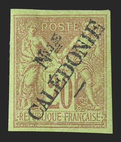 861 og Yvert #17a ImageYvert #17a, 1892 "Nlle/CALEDONIE" Ty. II overprint on 20c Red on green imperforate, large even margins all around, partly disturbed o.g., very fine; signed Bloch (Scott #16; $350.00). (Image) €420