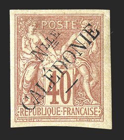 862 og Yvert #19a ImageYvert #19a, 1892 "Nlle/CALEDONIE" Ty. II overprint on 40c Red on straw imperforate, large to very large margins all around, slightly disturbed o.g., choice very fine and rare; only 100 stamps are believed to have been overprinted (Scott #18; $1,500.00). (Image) €2,500