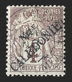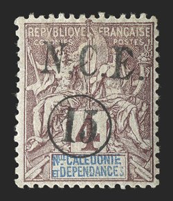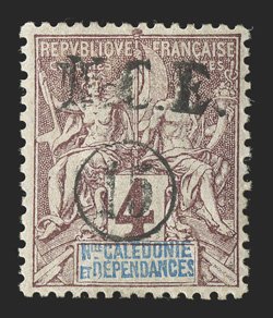 868 og Yvert #55b ImageYvert #55b, 1900 "N.C.E./15" Surcharged on 4c Claret on lavender in error, exceptionally well centered, o.g., extremely fine; only 150 stamps received the 15c on 4c surcharge in error; signed Bernichon (Scott #60 var.). (Image) €750