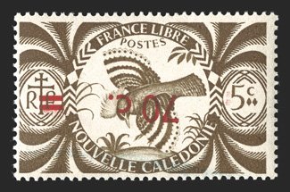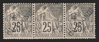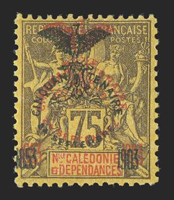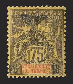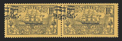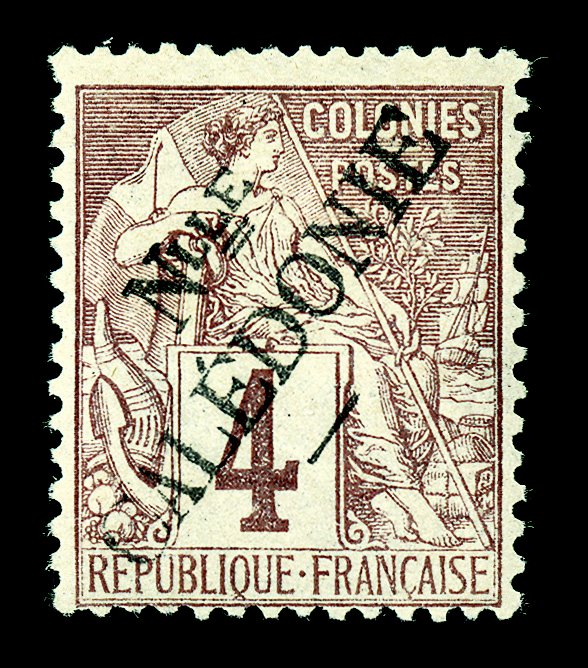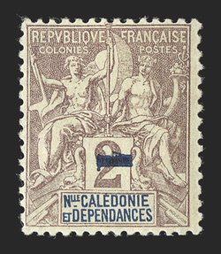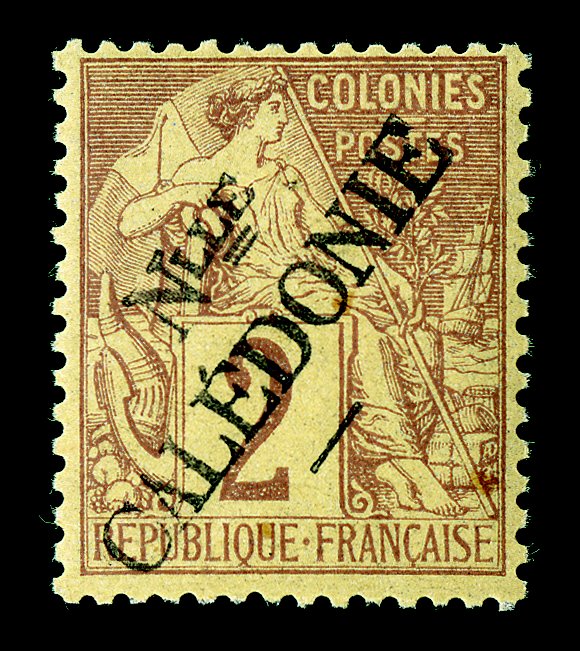 865 og Yvert #29 var. ImageYvert #29 var., 1892 "Nlle/CALEDONIE" overprint on 25c Black on rose, overprint omitted, the center stamp in a horizontal strip of three, the end stamps normal, strong and intact perforations, o.g., h.r., very fine; extremely rare if not unique; not listed in either Yvert or Maury, however the 35c and 75c values are listed as such, with a Yvert catalog value of €1,400 each; 1997 Behr certificate (Scott #28 var.). (Image) Est. $400-500