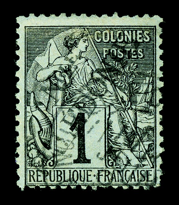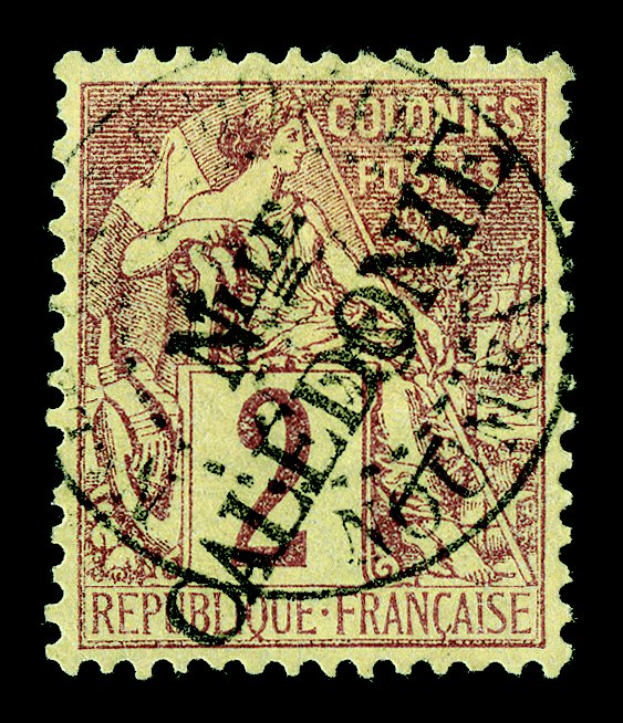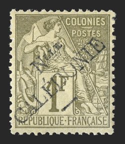 866 og Yvert #35 ImageYvert #35, 1892 "N-C-E/10" Blue surcharge on 1Fr. Bronze green and straw imperforate, a marvelous mint example of this very rare stamp, large even margins all around, deep rich color, o.g., h.r., very fine; only one sheet of 100 stamps was surcharged, many of which were used; signed Behr, Miro and others and accompanied by 1998 Behr certificate; ex-Gibralter (Scott #34; $5,250.00). (Image) €6,500