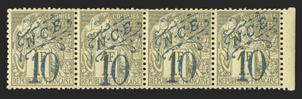 867 nh Yvert #37-40 ImageYvert #37-40, 1892 "N-C-E/5" Black and blue surcharges on 75c Carmine on rose and "N-C-E/10" black and blue surcharges on 1Fr. Bronze green on straw, attractive horizontal strips of four, remarkably fresh and well centered, o.g., n.h., very fine (Scott #36-39; $680.00). (Image) Maury €675
