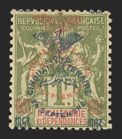 863 ogO Yvert Formerly #21-23 ImageYvert Formerly #21-23, 1892 "Nlle/CALEDONIE" overprints on 1c Black on lilac blue, 1c Black on azure, 2c Brown on buff and 4c Claret on lavender, group of six with mint 2c and 4c values with o.g. and the others all used with Noumea c.d.s., except the 1c Azure with clear blue Bourail datestamp, fine-very fine; these were listed in Yvert in 1928 and Maury in 1976, but are now considered to not have been officially issued, though they remain very scarce and highly collectable (Scott formerly #20-22). (imagea) (imageb) (imagec) (imaged) (imagee) (Image) Est. $500-750