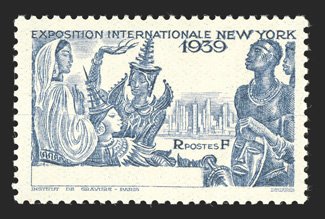 877 nh Yvert #174a ImageYvert #174a, 1939 2.25Fr. New York World's Fair, value and country name omitted, having been caused by a foldover during printing, resulting in the "25" of the denomination and the last letter of the country name appearing on the gummed side, fresh and well centered, o.g., n.h., diagonal gum crease, otherwise very fine and very rare; signed Roumet and accompanied by his 2003 certificate (Scott #216 var.). (Image) Maury €2,150