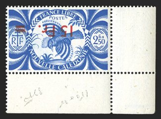 881 nh Yvert #256a ImageYvert #256a, 1945 "15Fr." Surcharge on 2.50Fr Bright blue, inverted surcharge, bottom right corner margin single, o.g., n.h., extremely fine (Scott #273 var.). (Image) Maury €600