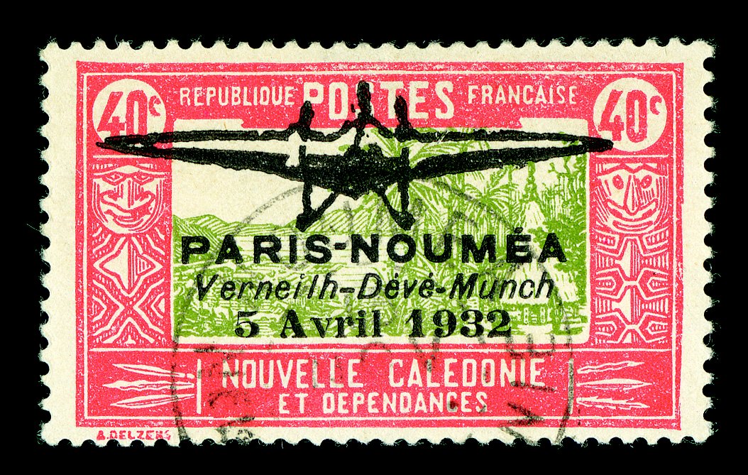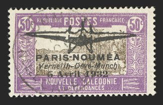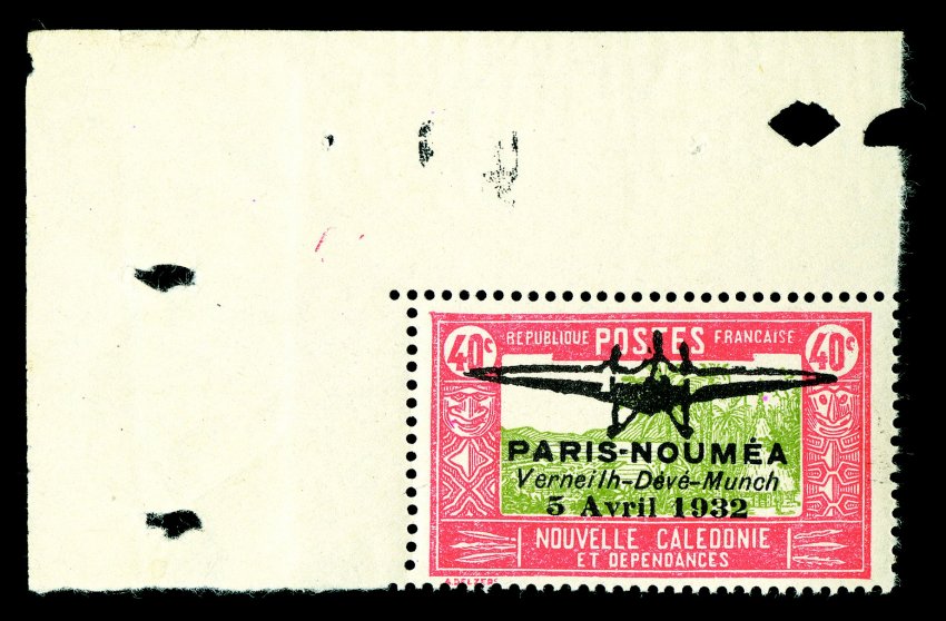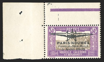 883 nh Yvert #PA1-2 ImageYvert #PA1-2, 1932 "PARIS-NOUMEA/Verneilh-Deve-Munch/5 Avril 1932" overprints on 40c Bright red and olive green and 50c Violet and brown, handsome top left corner margin mint singles, o.g., n.h., fine-very fine; seldom found never hinged (Scott #180-81; $1,400.00). (imagea) (Image) Maury €1,800