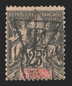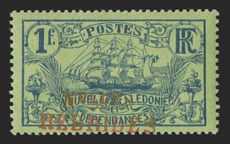 894 E   Image1908 "Nelles/HEBRIDES" essay overprints on stamps of New Caledonia, group comprised on 5c, 10c, 25c, 50c and 1Fr. singles and millesimes gutter pairs of the 5c, 10c, 25c and 50c values, o.g., mostly l.h., fine-very fine and scarce; the singles signed Pavoille. (Image) Est. $400-500