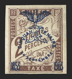 886 og Yvert #TT8-15 ImageYvert #TT8-15, 1903 Jubilee overprint on 5c-2Fr. Postage dues cplt., each with ample to mostly large margins, the key 2Fr. value uncommonly fresh, o.g. or h.r., except 5c no gum, 5c and 50c thinned spots, otherwise a very fine set with an especially nice 2Fr. value, of which only 300 copies were produced; 2Fr. signed Champion twice (Scott #J1-8; $1,724.00). (Image) €2,148