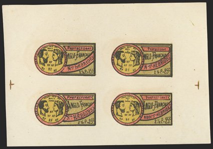 887 E   Image1893 2½d = 25c Military franchise essays, comprised of four approximately 180x115mm lithographed proof sheets of four vignettes, the first being the black outline only, the second the red, grey-blue and ocher background colors only, and two finished sheets of four showing different three-color combinations, plus a single in yet a different color combination, fresh and very fine; a rare and attractive offering; these were supposedly designed by a Lt. Col. Delauney and depict the martyred French President, Sadi Carnot and Queen Victoria, the bi-national character of the legend and denomination makes the major interest in these items a foreshadowing of the Condominium. (Image) Est. $500-750