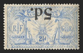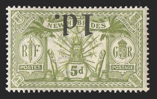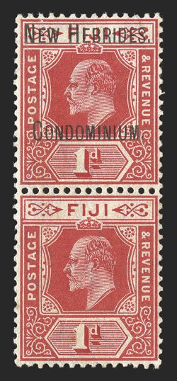888 og S.G. #2a ImageS.G. #2a, 1908 "NEW HEBRIDES./CONDOMINIUM." overprint on 1d Red, overprint omitted in vertical pair with normal, the bottom stamp the error, strong and intact perforations, slightly toned o.g. as usual, very lightly hinged, very fine; a great rarity of the British Commonwealth and the first example we have had the pleasure to offer in our auctions; this error occurred on the fourth horizontal row of one sheet, therefore, only twelve examples are possible; signed Bloch and accompanied by his 1981 Friedl certificate (Scott #8a; $10,000.00). (Image) £9,000