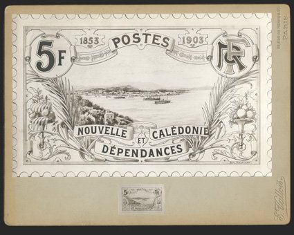 893 E   Image1903 Essay for proposed first issue 5Fr. definitive, large 243x154mm black and white ink and wash design depicting a view of Vile harbor by Ben Damman, mounted on art board with the imprint of E. Vallois of Paris, with a stamp-sized photographic print of the same design mounted beneath, very fine and attractive; unique. (Image) Est. $400-500