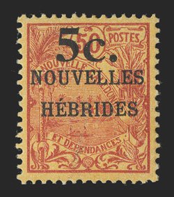 895 og Yvert #58A ImageYvert #58A, 1920 "5c./NOUVELLES/HEBRIDES" surcharge on 50c Carmine on orange, fresh and well centered, o.g., l.h., very fine and scarce; only 300 stamps were surcharged; signed Calves (Scott #35; $900.00). (Image) €1,400