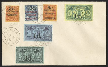 896 c Yvert #58A ImageYvert #58A, 1920 "5c./NOUVELLES/HEBRIDES" surcharge on 50c Carmine on orange, cancelled along with 5c on 50c and 10c on 25c surcharges, plus "1d." surcharges on 1/- to 5/- (Yvert #58, 59, 65-67) on fresh unaddressed cover, very fine (Scott #33-35 and Br. 27-29; $1,141.90 for used). (Image) for used €1,741
