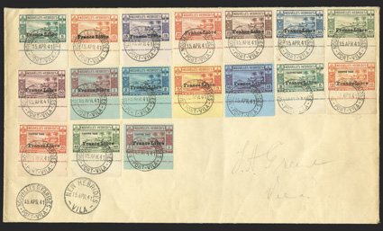897 FDC Yvert #124-35, TT21-25 ImageYvert #124-35, TT21-25, 1941 "France Libre" Overprints on 5c-10Fr. Beach scene and 5c-1Fr. Beach scene postage dues cplt., matched set of bottom sheet-margin singles, each cancelled by separate strike of "Nouvelles Hebrides/Port-Vila/15 APR 41" first day of issue postmarks to large cover, additional strike of British postmark, 5c postage due damaged and 5c and 10c postage dues with some staining, otherwise very fine and rare (Scott #67-78, J11-15; $591.00 for used). (Image) Est. $200-300