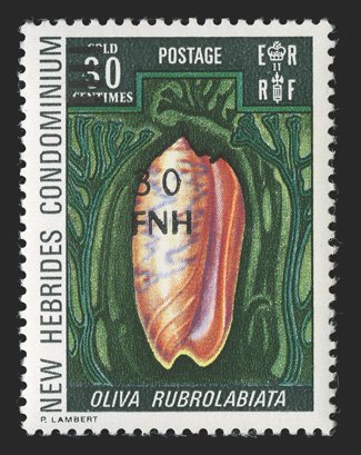 900 nh Yvert #488B var. ImageYvert #488B var., 1977 "30/FNH" Port Villa local surcharge on 30c Dark green and multicolored, error "FHN" for "FNH", bottom left corner margin single, o.g., n.h., very fine and rare; fewer than 25 examples are believed to exist (Scott #241a var., $300.00 for normal). (Image) Est. $300-400