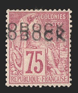942 og Yvert #19a B ImageYvert #19a B, 1892 "OBOCK" Straightline overprint on 75c Carmine on rose, double overprint, well centered and quite fresh, o.g., very fine; signed A. Brun twice (Scott #19 var.). (Image) €1,100
