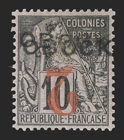 943 ogO Yvert #21-31 ImageYvert #21-31, 1892 "1" to "5F" Surcharges on 10c-1Fr. Commerce cplt., all mint except 30c and 35c used, others o.g., h.r., except 75c no gum, fine-very fine; the scarce 5Fr signed Calves twice (Scott #21-31; $1,003.00). (Image) €1,572