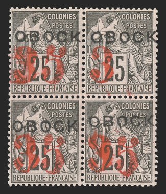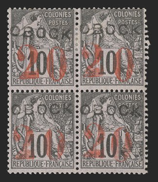 949 og/nhbl Yvert #29c ImageYvert #29c, 1892 "35" Surcharge on 25c Black on rose, omitted "5" in surcharge, wonderfully fresh mint block of four, the top right stamp the error and the other three normal, strong and intact, o.g., l.h., bottom stamps n.h., very fine and choice; each signed J-F Brun (Scott #29a; $735.00 for hinged singles). (Image) for hinged €1,360+