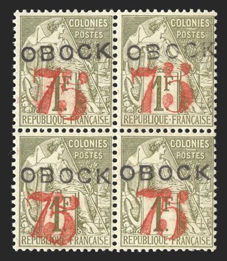 950 nhbl Yvert #30 ImageYvert #30, 1892 "75" Surcharge on 1Fr. Bronze green on straw, post office fresh mint block of four, nicely centered, pristine o.g., n.h., very fine; only 1,600 stamps were issued; each signed J-F Brun (Scott #30; $300.00 for hinged). (Image) for hinged €520