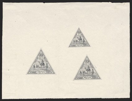 953 P Yvert #47-64P ImageYvert #47-64P, 1894 1c-50Fr. Warrior proofs in black, the complete set of eighteen values comprised of one single proof, seven double proofs including 5Fr. and 50Fr. together and one triple proof with 2Fr., 10Fr. and 25Fr. together, latter with a harmless vertical fold, very fine; a handsome and rare set (Scott #46-64P). (Image) Est. $750-1,000